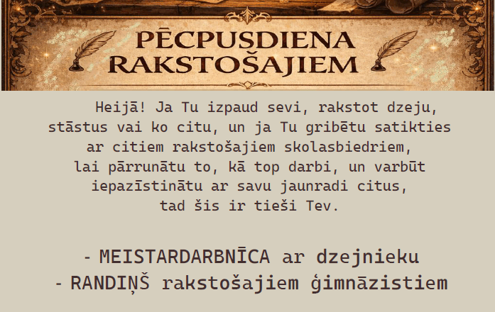 Lasīt vairāk → 10.decembrī ar programmas Latvijas skolas soma atbalstu mācību stunda ” Radošā rakstīšana” skolēniem notika Latvijas Nacionālajā rakstiecības un muzikas muzeja filiālē.