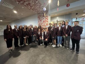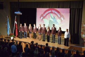 Kopā ar skolas mūzikas studijas jauniešiem visa ģimnāzijas saime vienojās Latvijas valsts himnas dziedājumā 🎶, pēc kā skolēnus un skolotājus sveica Izglītojamo padomes prezidente Liveta Birzgale, atgādinot, ka Latvijas nākotne ir mūsu rokās. 💫