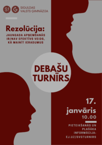 Turnīrs notiks 17. janvārī Siguldas Valsts ģimnāzijā, un tajā piedalīties aicināti gan pamatskolas, gan vidusskolas debatētāji no visas Latvijas.
