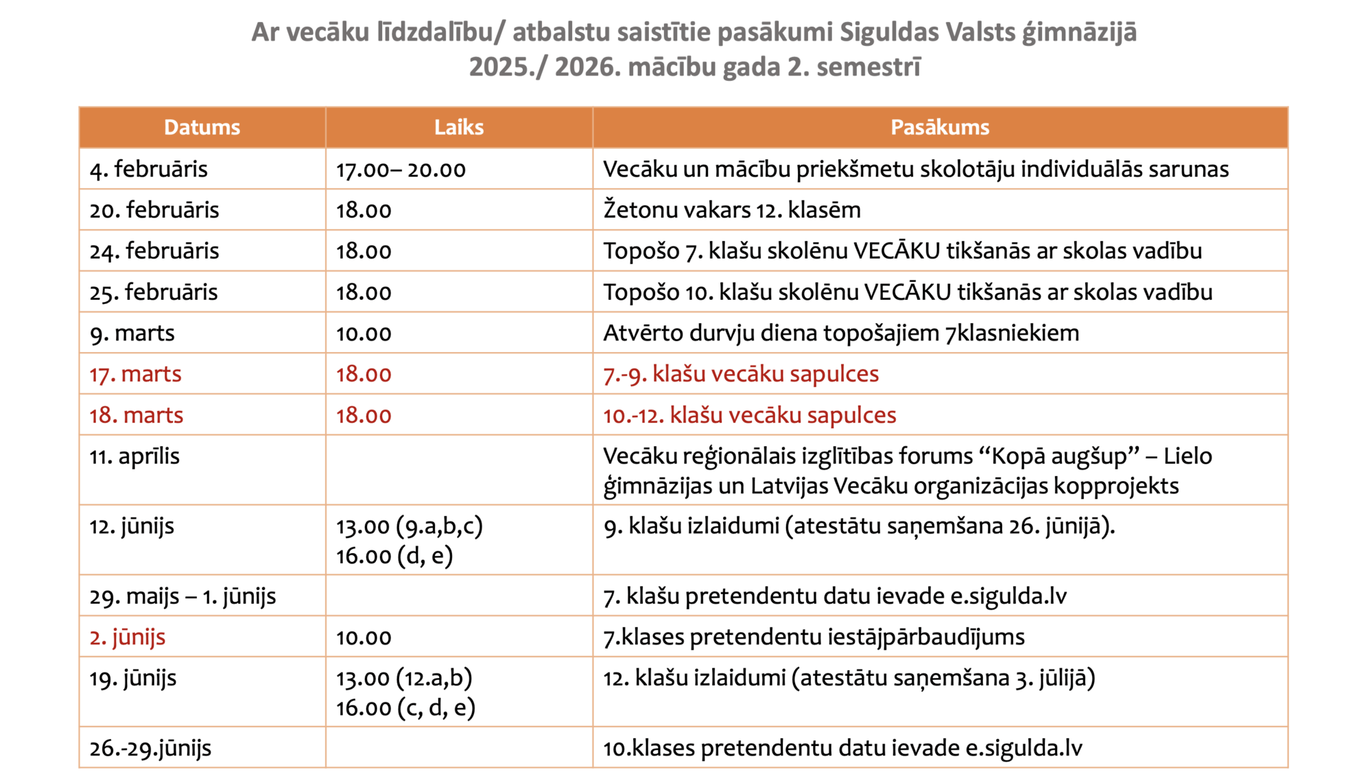 NEDAUDZ LABOTS UN PAPILDINĀTS. Ar vecāku līdzdalību / atbalstu saistītie pasākumi Siguldas Valsts ģimnāzijā 2025./ 2026. mācību gada 2. semestrī