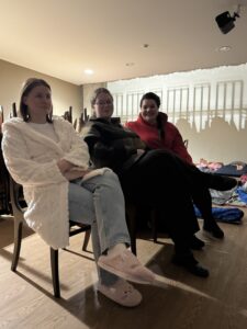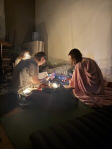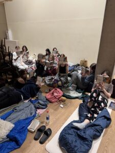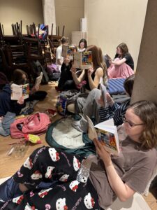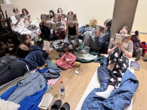 Vakars iesākās, sarunājoties un iekārtojot savas nakts lasīšanas gultasvietas – ar matračiem, plediem, spilveniem un lampiņam, tādējādi radot īpaši